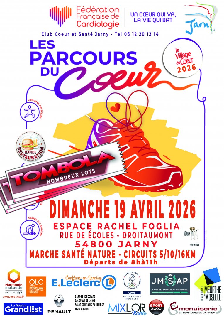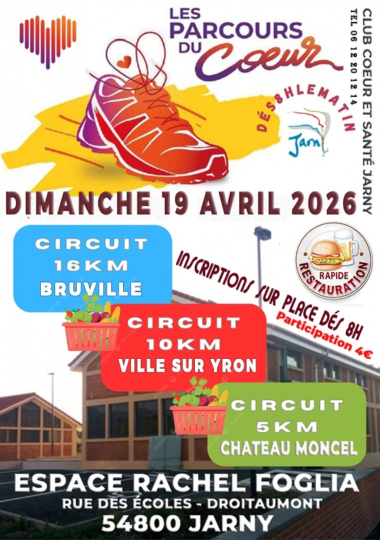 Le Club Coeur et Santé Jarny (Fédération Française de Cardiologie) vous donne rendez-vous dimanche 19 avril 2026 pour une journée dédiée à la santé, au sport et au bien-être, avec plusieurs parcours de marche au choix.